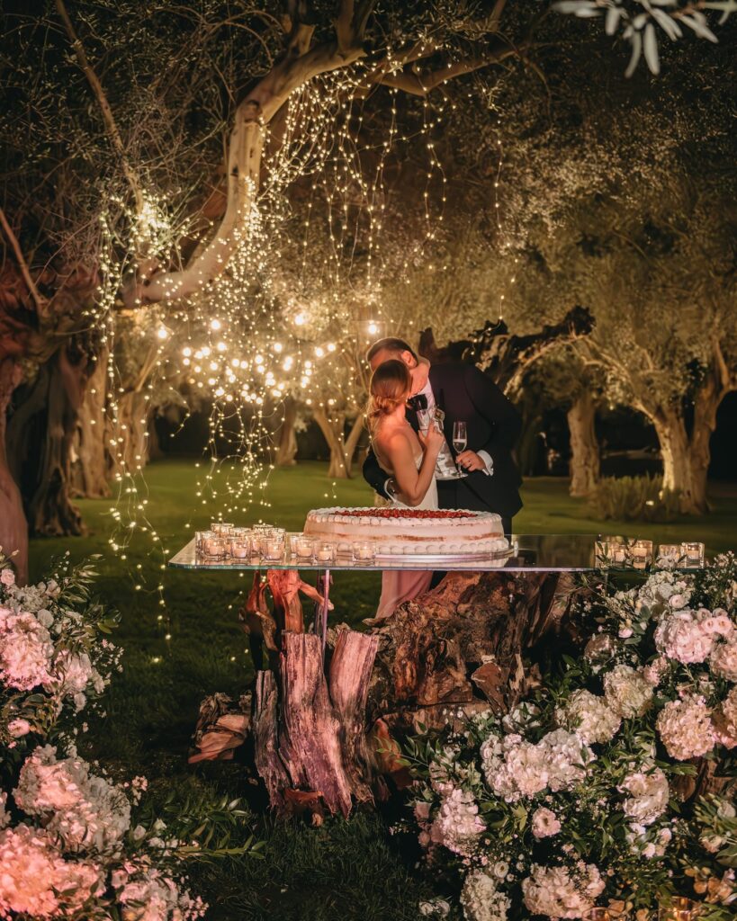 Gli invitati arrivano mentre il cielo si fa velluto. Abiti lunghi che sfiorano il prato, tessuti che riflettono le lanterne accese tra gli alberi, dettagli preziosi che vibrano nella penombra. L’atmosfera si fa avvolgente, le conversazioni più morbide, i gesti più lenti. La struttura accompagna ogni momento dell’evento con naturalezza. Dall’aperitivo sulle terrazze al momento centrale della cena, fino al taglio torta sotto le stelle e alla danza nel cuore della notte, gli spazi si trasformano senza perdere coerenza.