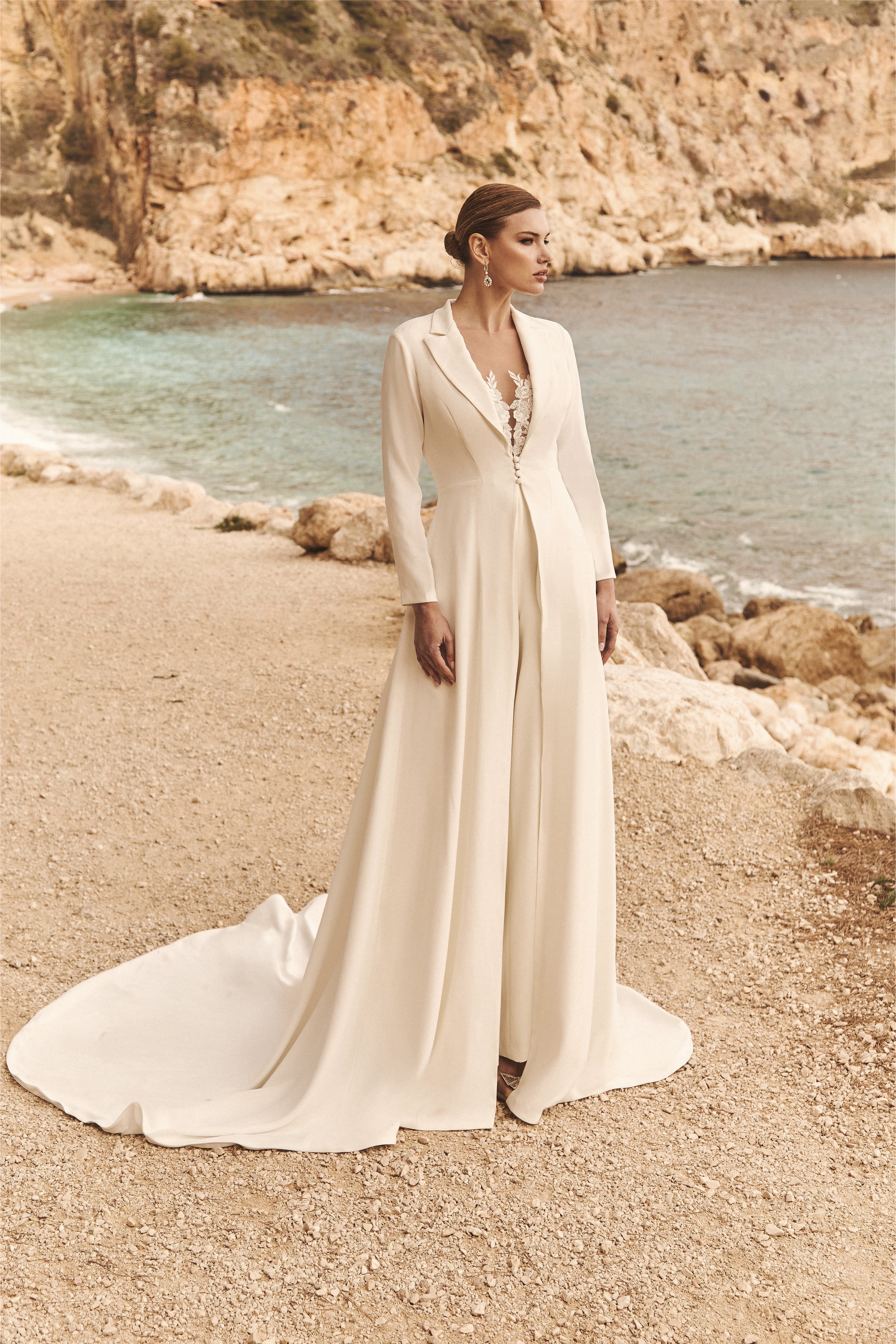 La jumpsuit, invece, rappresenta la soluzione più moderna e audace, per la sposa che desidera distinguersi. Un capo unico, essenziale e sofisticato, che valorizza il punto vita, slancia la figura e accompagna il movimento con naturalezza.